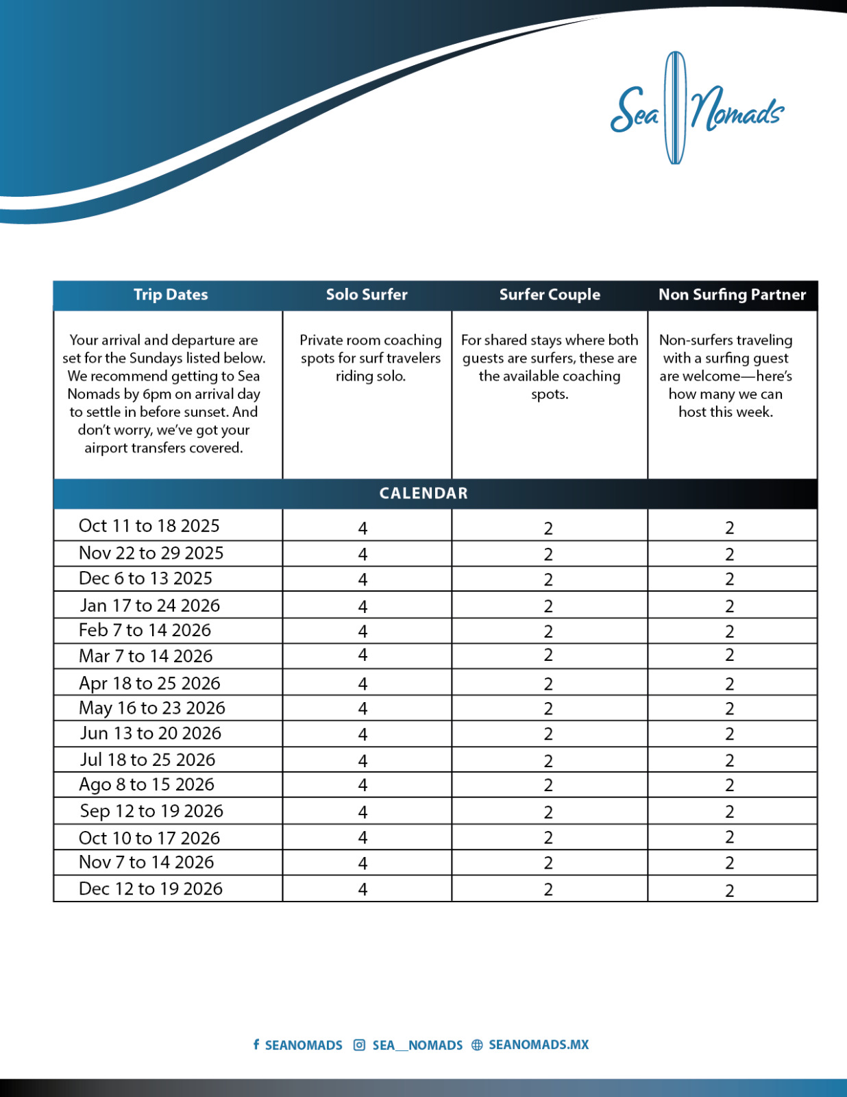 Discover the thrill of surfing with Sea Nomads. We offer unforgettable surf retreats tailored for solo surfers, couples, and non-surfing partners. Check our availability and book your dream surf getaway today! Limited spots available.